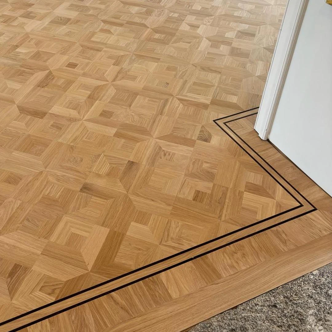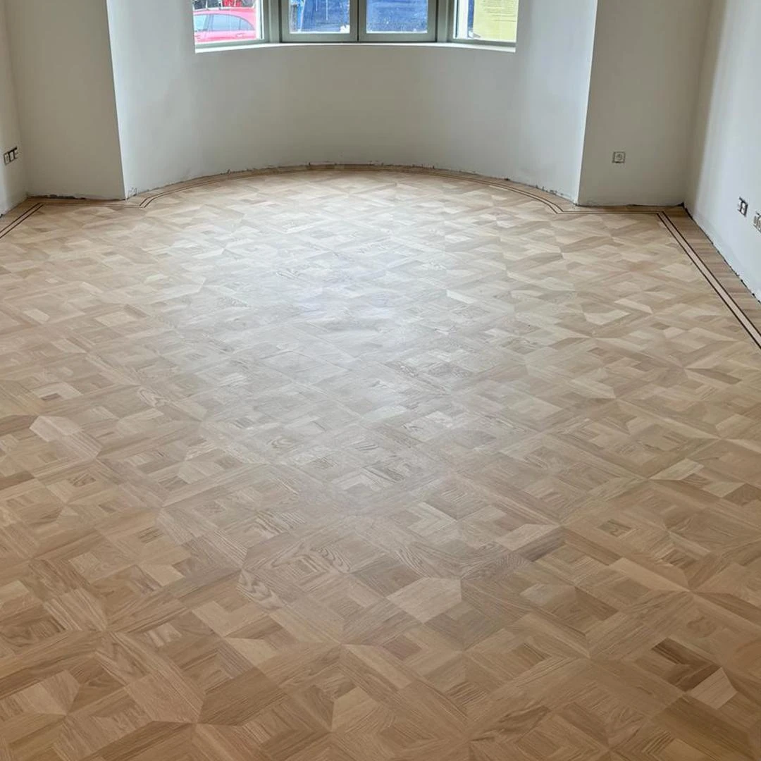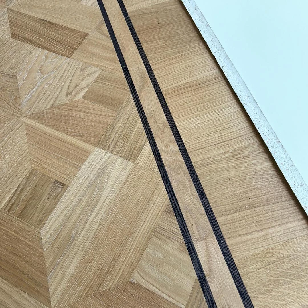 Dit project combineert massief eiken stijlparket met een diagonaal plaatsingspatroon en een hoogwaardige afwerking in OSMO 3040 White Wash hardwaxolie. Het Empire-motief brengt een klassieke signatuur met verfijnde details, terwijl de diagonale legwijze de ruimte een dynamisch en ruimtelijk gevoel geeft.De OSMO 3040 White Wash zorgt voor een elegante, licht vergrijsde uitstraling en biedt tegelijk duurzame bescherming tegen dagelijkse slijtage. Dankzij de verlijmde plaatsing blijft de vloer stabiel en stil, met een resultaat dat jarenlang mooi blijft.