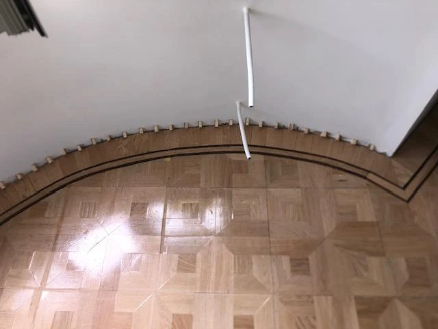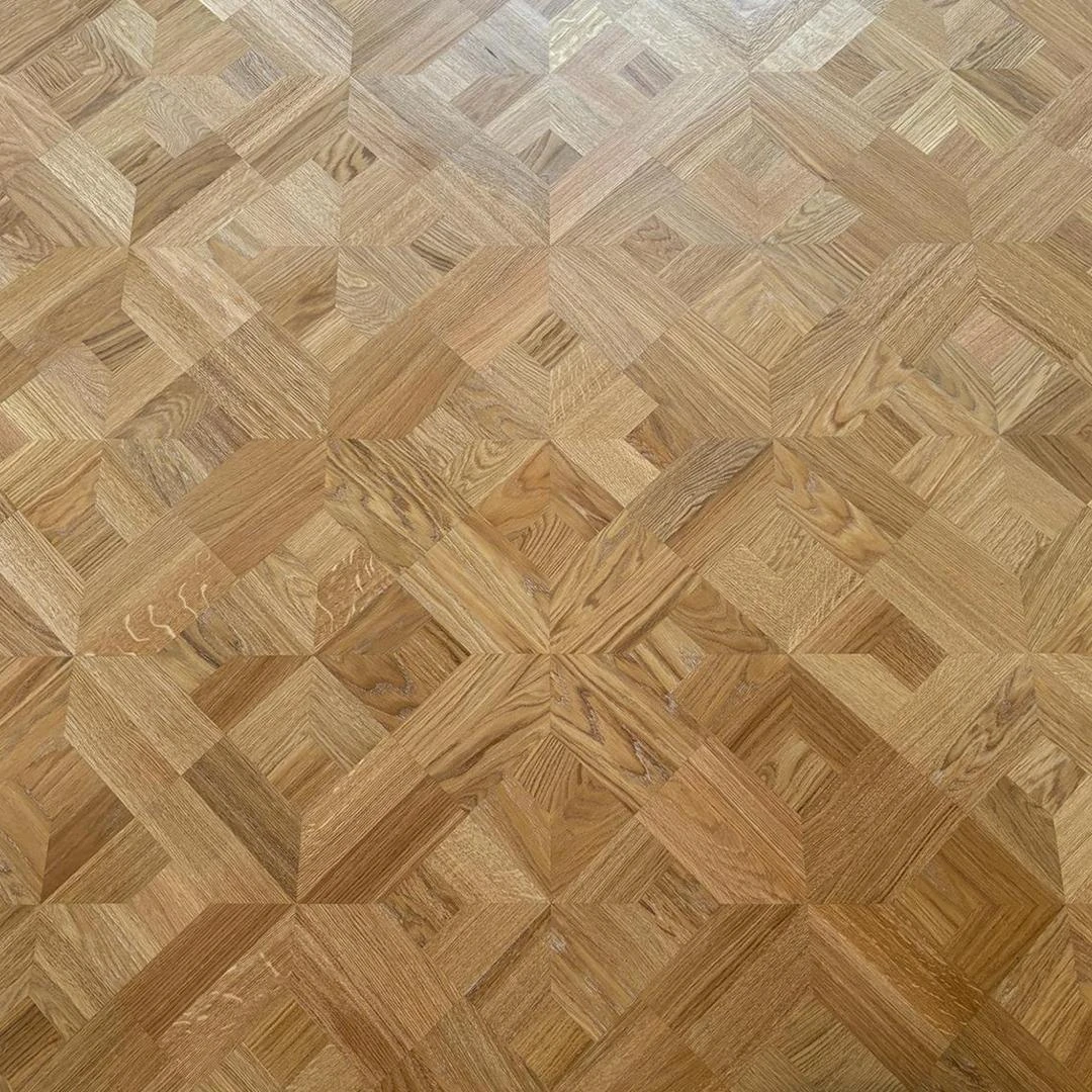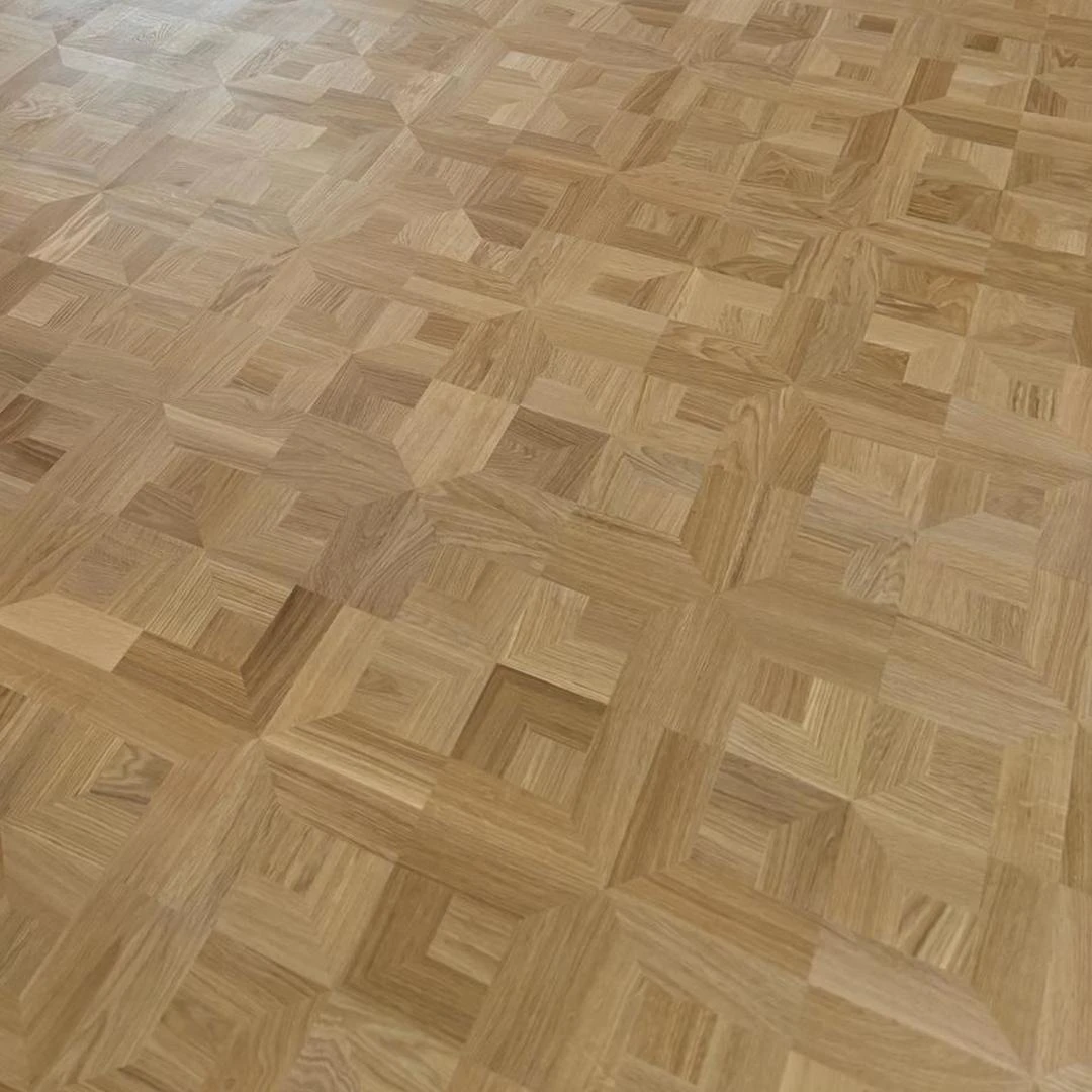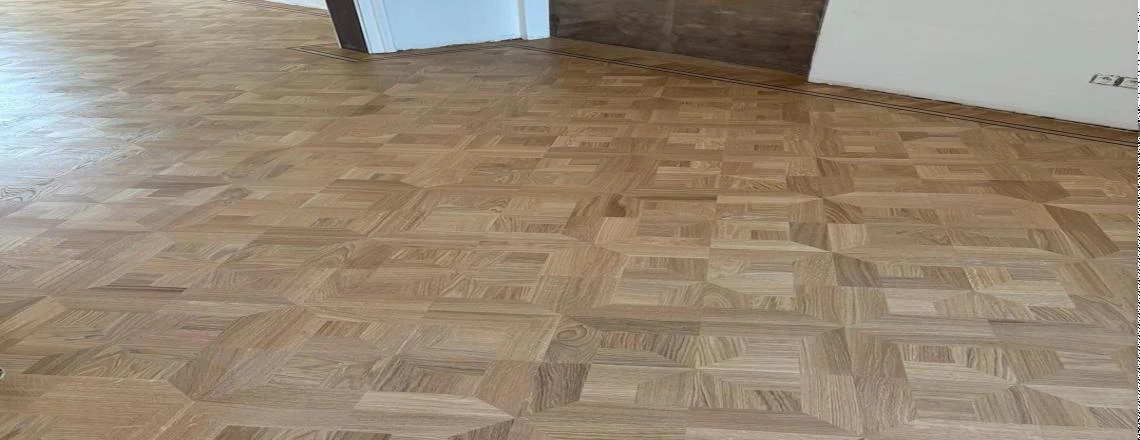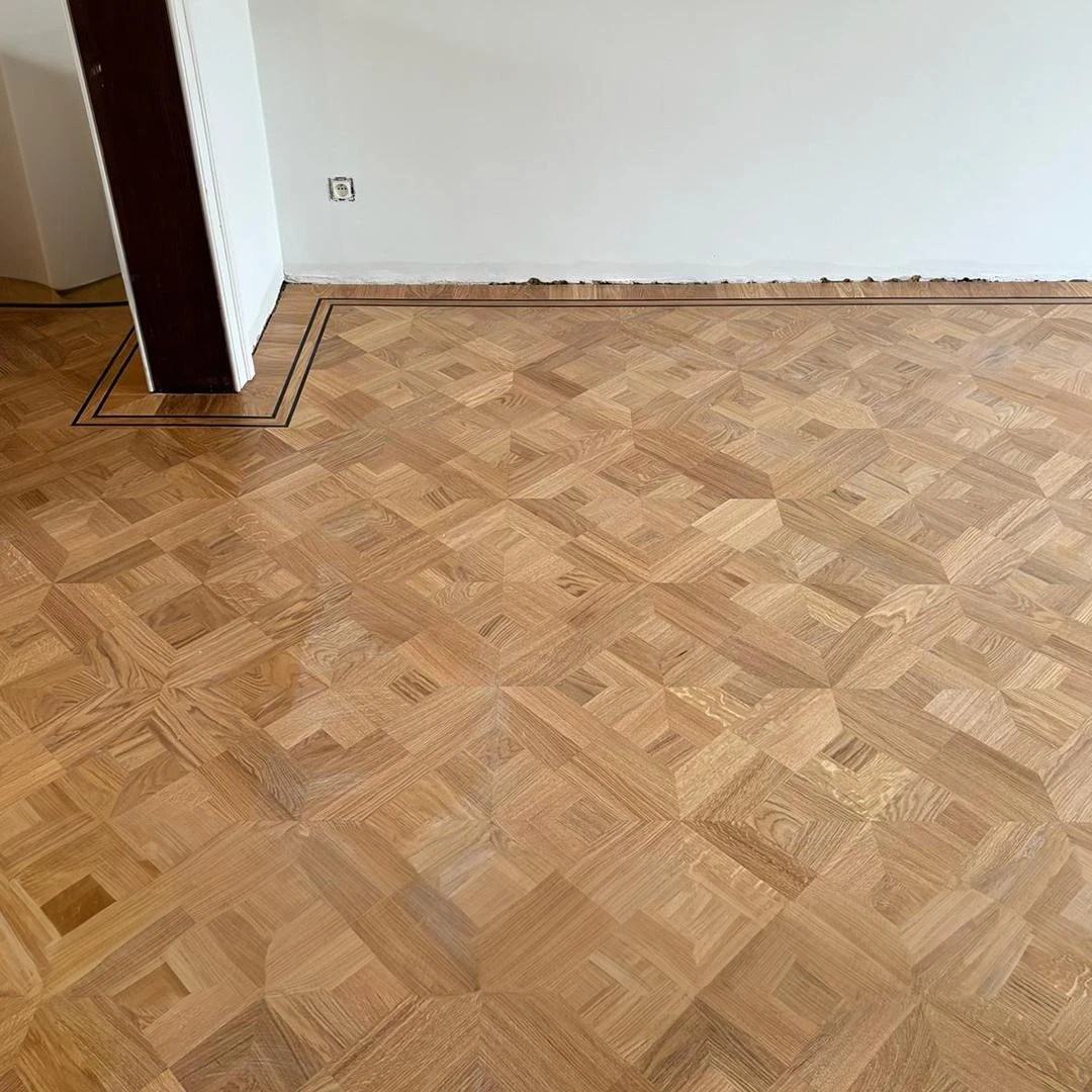 Dit project combineert massief eiken stijlparket met een diagonaal plaatsingspatroon en een hoogwaardige afwerking in OSMO 3040 White Wash hardwaxolie. Het Empire-motief brengt een klassieke signatuur met verfijnde details, terwijl de diagonale legwijze de ruimte een dynamisch en ruimtelijk gevoel geeft.De OSMO 3040 White Wash zorgt voor een elegante, licht vergrijsde uitstraling en biedt tegelijk duurzame bescherming tegen dagelijkse slijtage. Dankzij de verlijmde plaatsing blijft de vloer stabiel en stil, met een resultaat dat jarenlang mooi blijft.