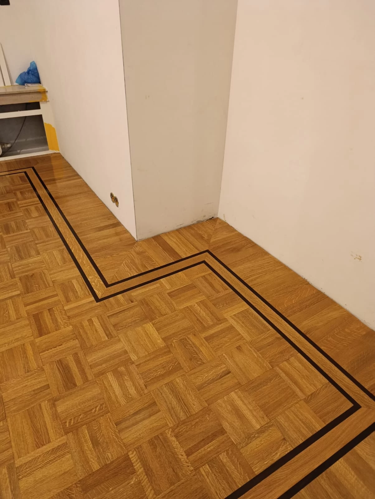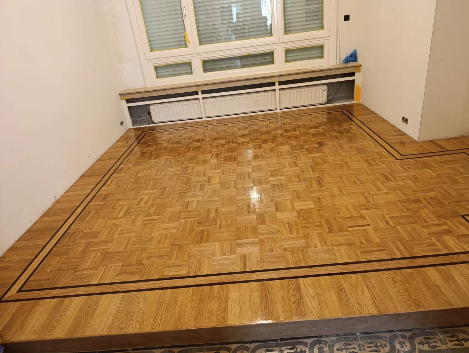Rond het borduurwerk werd een buitenkader geplaatst in dikker massief parket: