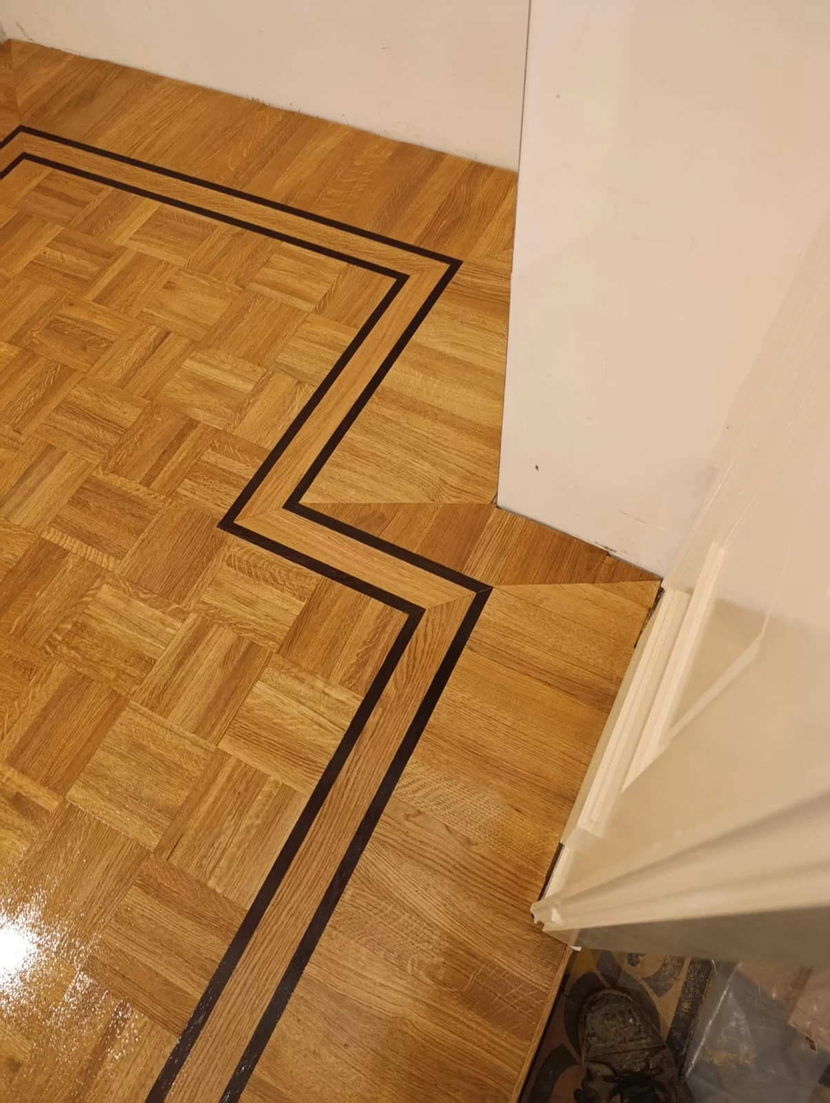 Dit project werd uitgevoerd in een klassiek herenhuis in Borgerhout (Antwerpen), gekenmerkt door hoge plafonds van 3 tot 4 meter. Het doel was het plaatsen van een op maat ontworpen massief mozaïekparket, afgewerkt met een luxueuze en tijdloze borduurrand die perfect aansluit bij de authentieke architectuur van het pand.