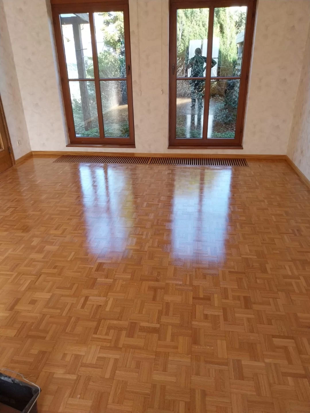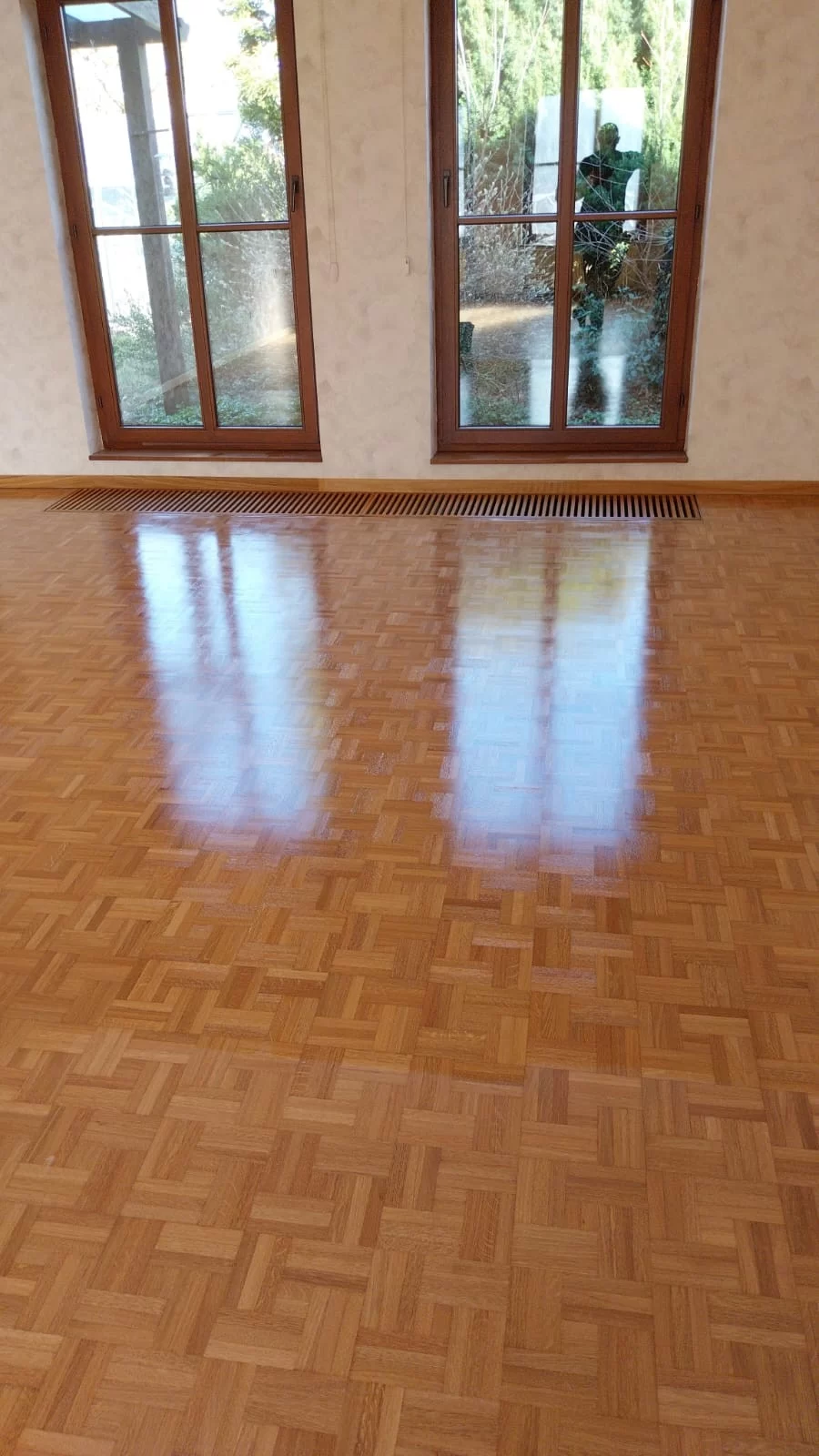 Na het opvullen en de laatste fijnschuring wordt het parket professioneel vernist. Voor dit soort mozaïekparket renovaties werken we doorgaans met hoogwaardige vernissen van Blanchon of Irsa, die garant staan voor een duurzame bescherming en een stijlvolle uitstraling.