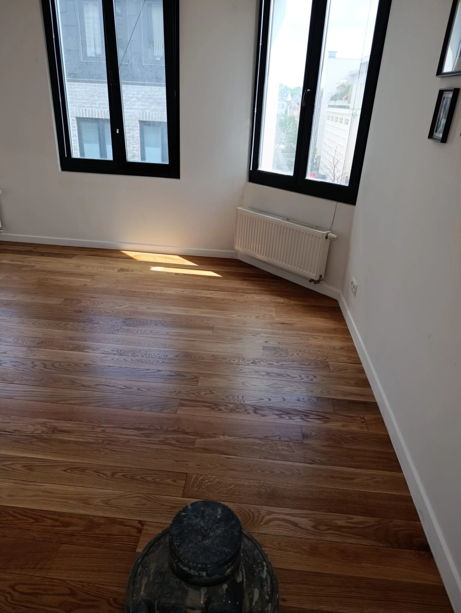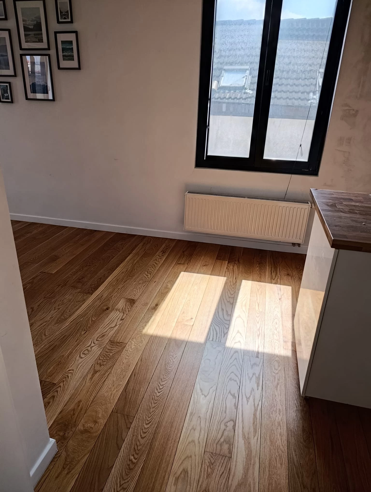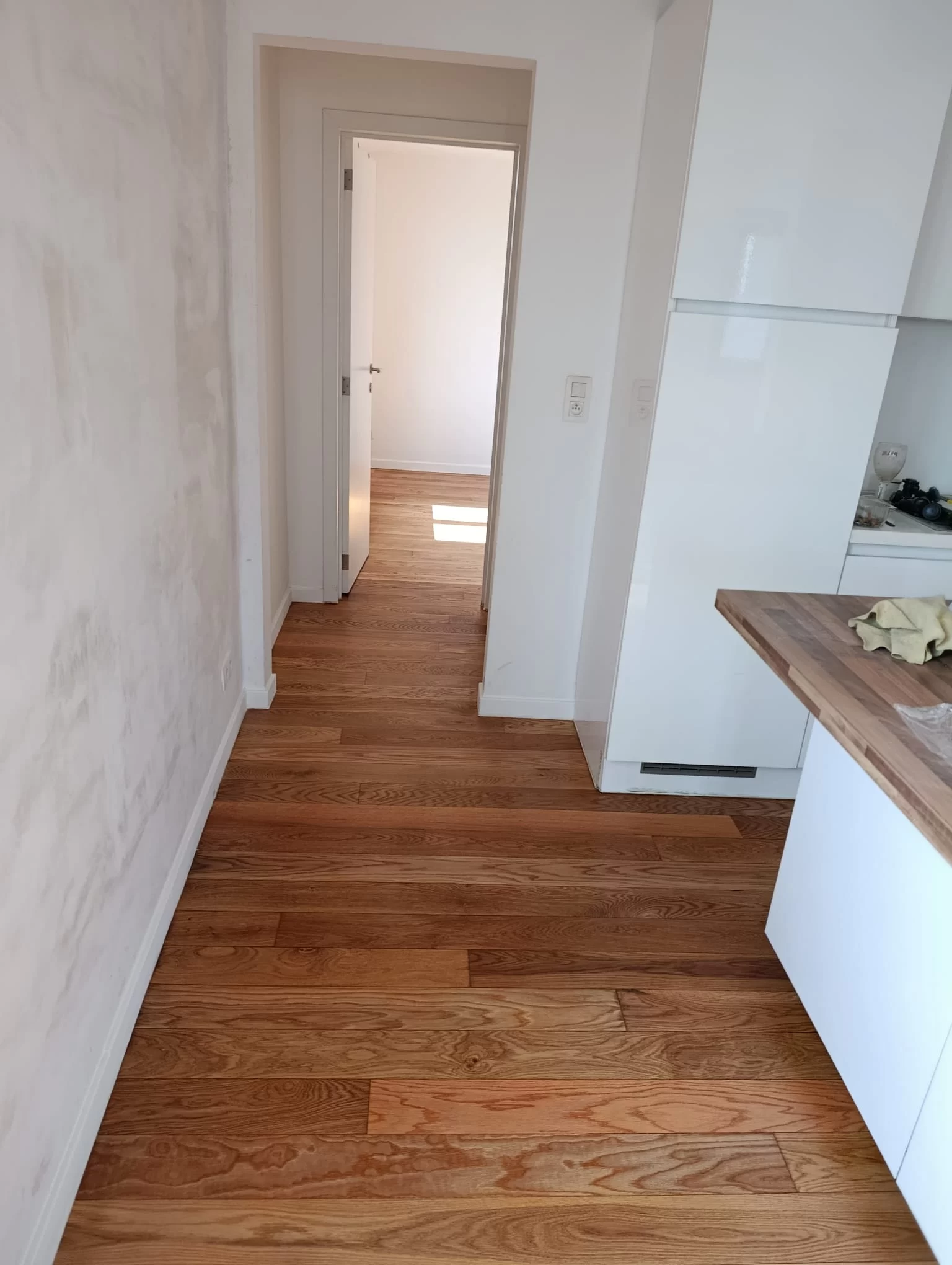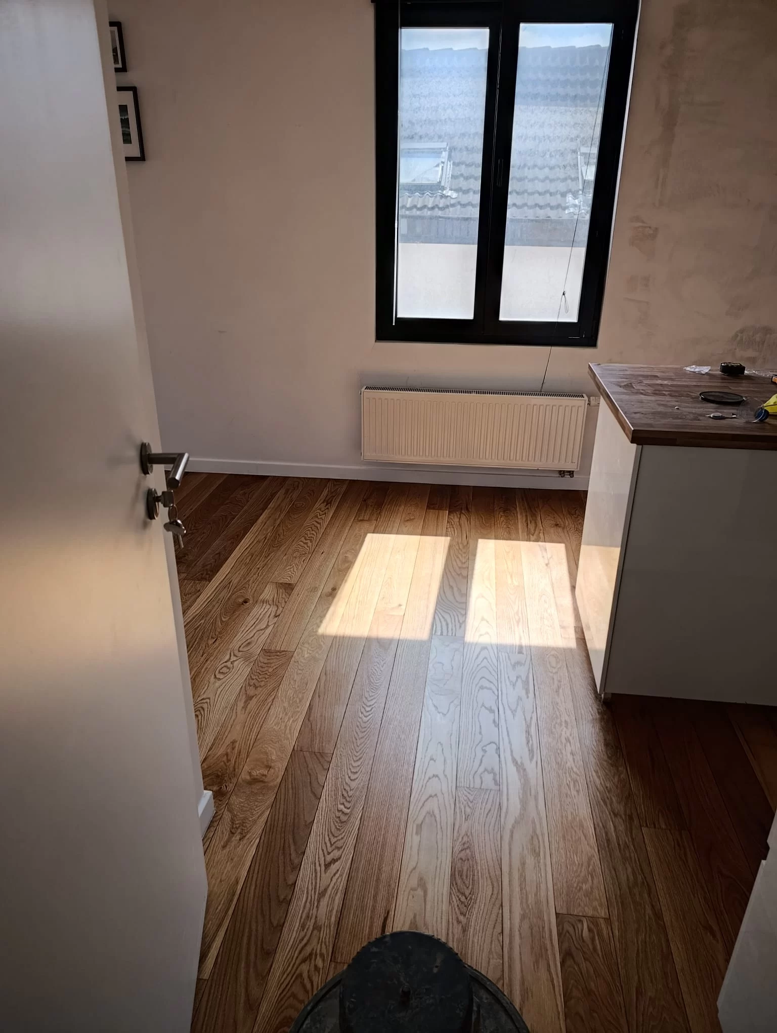Dankzij deze totaalrenovatie van de parketvloer werd de vloer voor ongeveer 95% vernieuwd. Het resultaat overtrof de verwachtingen van de klant: het appartement oogt nu stijlvol, fris en volledig afgewerkt, met een warme en natuurlijke uitstraling dankzij het massief eiken parket en de perfect afgewerkte details.